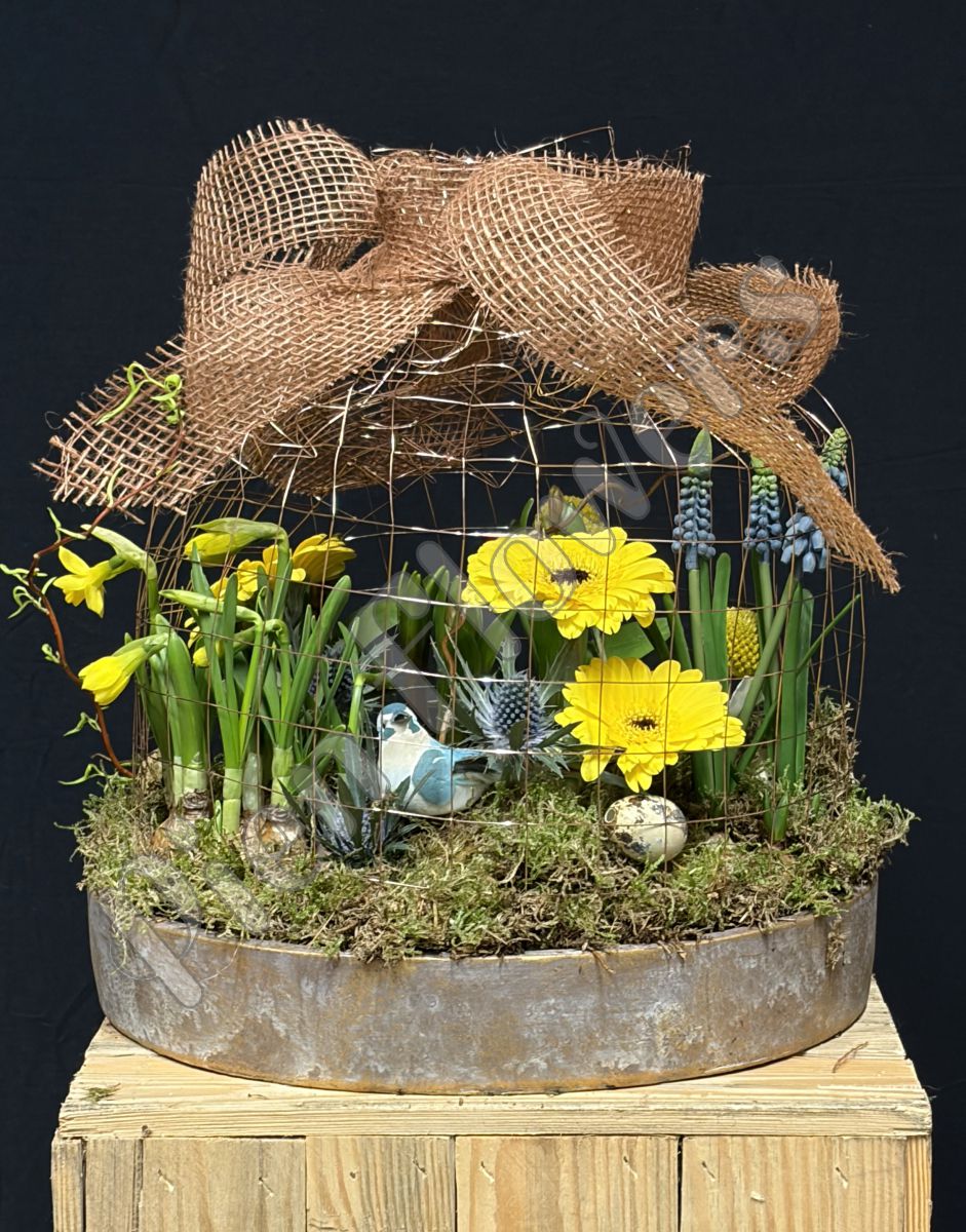3) tafel design, leuke mand met diverse bloembollen en verse bloemen , takken en konijn, naar eigen wens te decoreren.